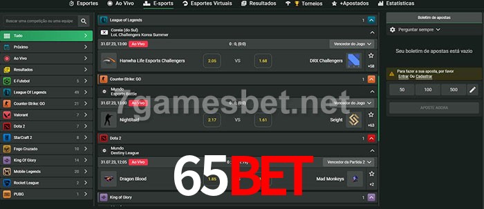 O 65Bet oferece uma grande seleção de opções de apostas em e-sports com probabilidades competitivas